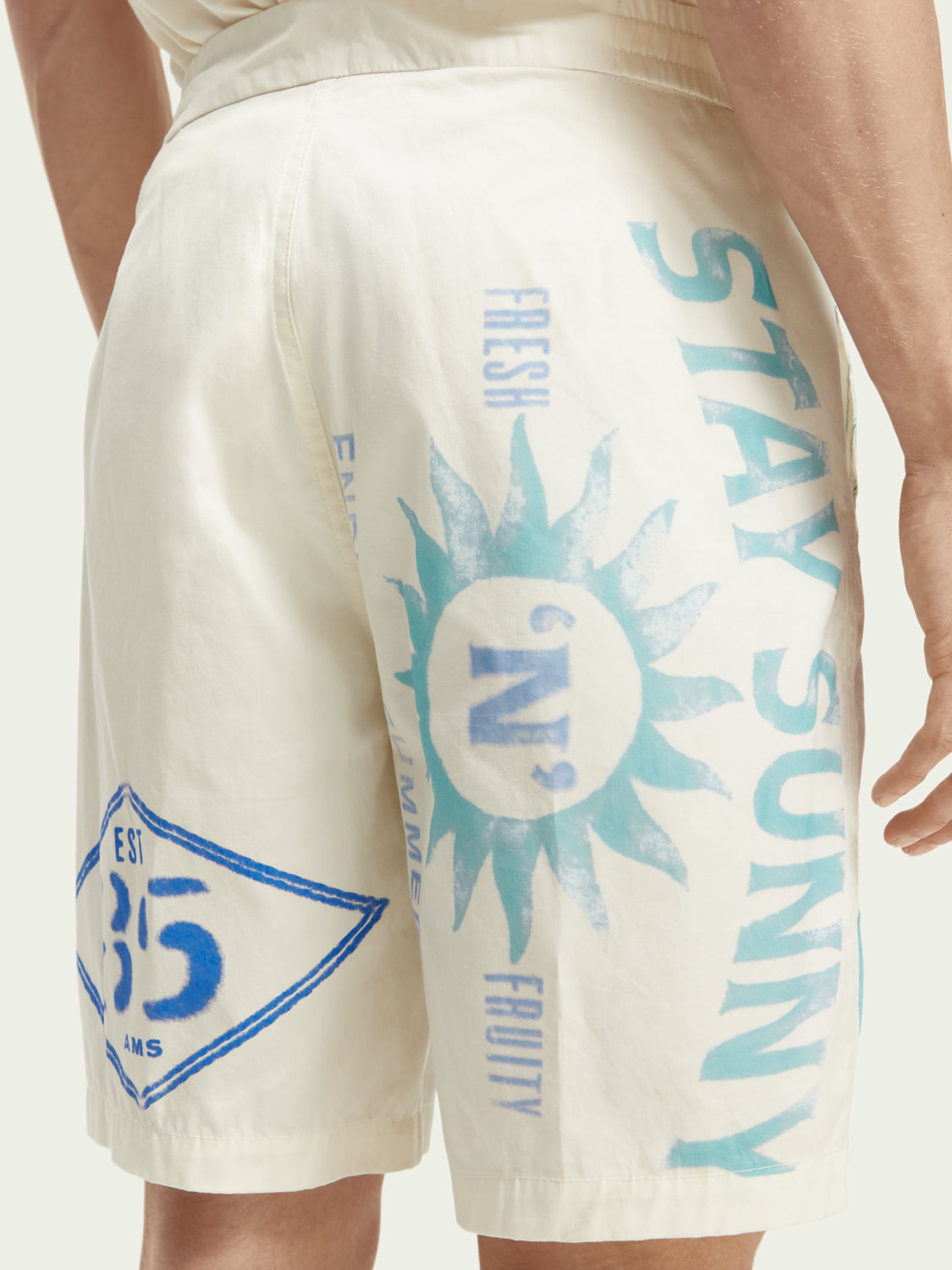 Arrivé juste à temps pour faire face à la hausse des températures, notre dernière variation du bermuda intemporel se pare d’un imprimé accrocheur aux énergies relaxantes et accueillantes. Doté d’une taille élastique à cordon de serrage pour un ajustement parfait, cet article facile à assortir est une pièce incontournable de toute garde-robe. Ce vêtement contient du Kapok FLOCUS™, une fibre naturelle présente dans le fruit du kapokier. La croissance de ces arbres ne nécessite aucun engrais, pesticide ou eau supplémentaire, tandis que ces derniers sont bénéfiques pour la biodiversité et l'absorption de CO2. Doté de propriétés régulant naturellement la chaleur, le Kapok est doux, léger, hydrophobe et antibactérien.