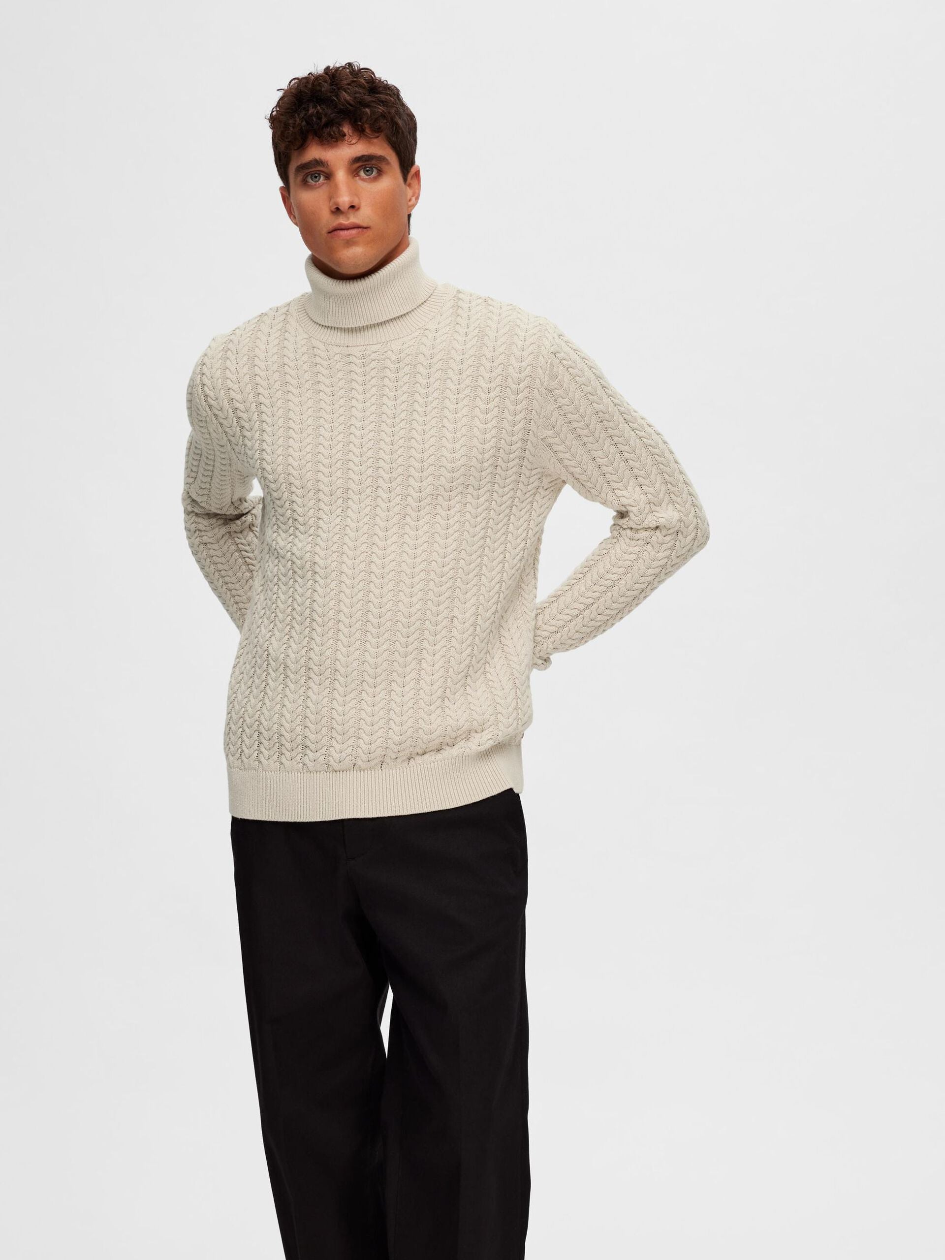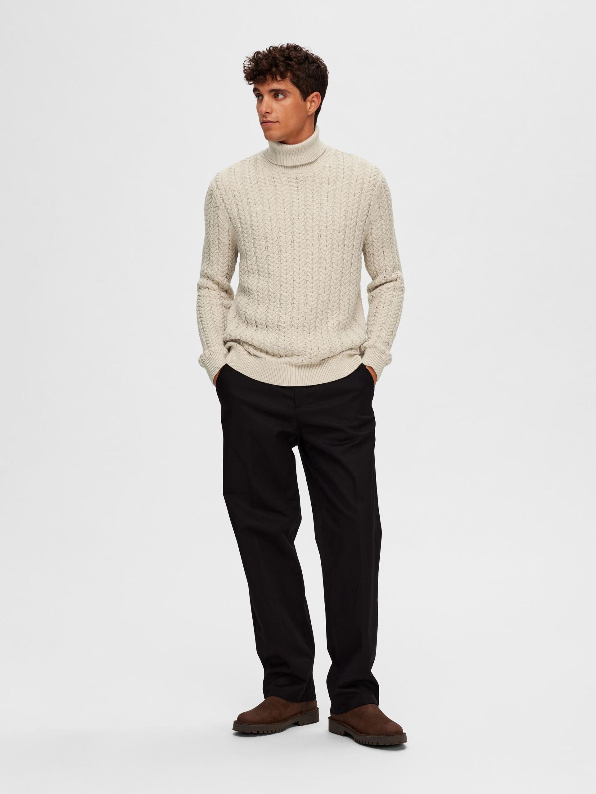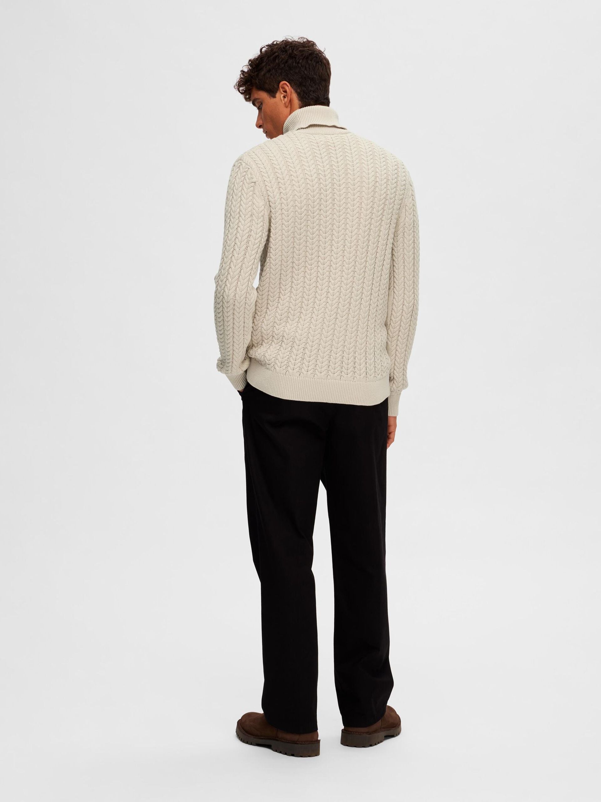 Ce col roulé en maille torsadée vous accompagnera à coup sûr tout au long de l'automne. Il présente un tissage torsadé classique inspiré du riche héritage des pêcheurs et est fabriqué à partir de coton biologique doux et respirant. Portez-le avec un jean foncé et des bottes en cuir. - Col roulé - Manches longues - Bordures côtelées - Modèle en maille torsadée - Coupe droite CONÇU