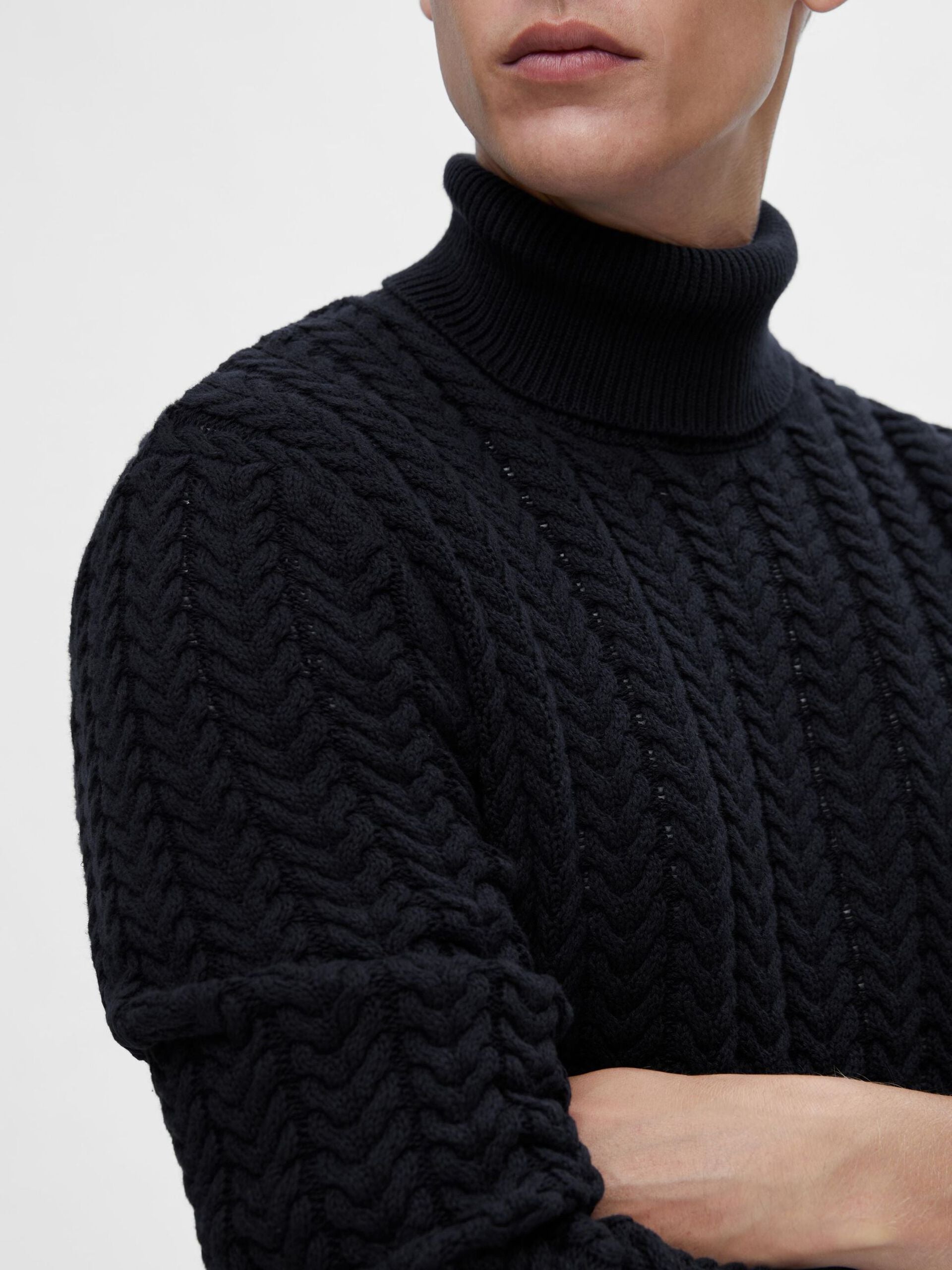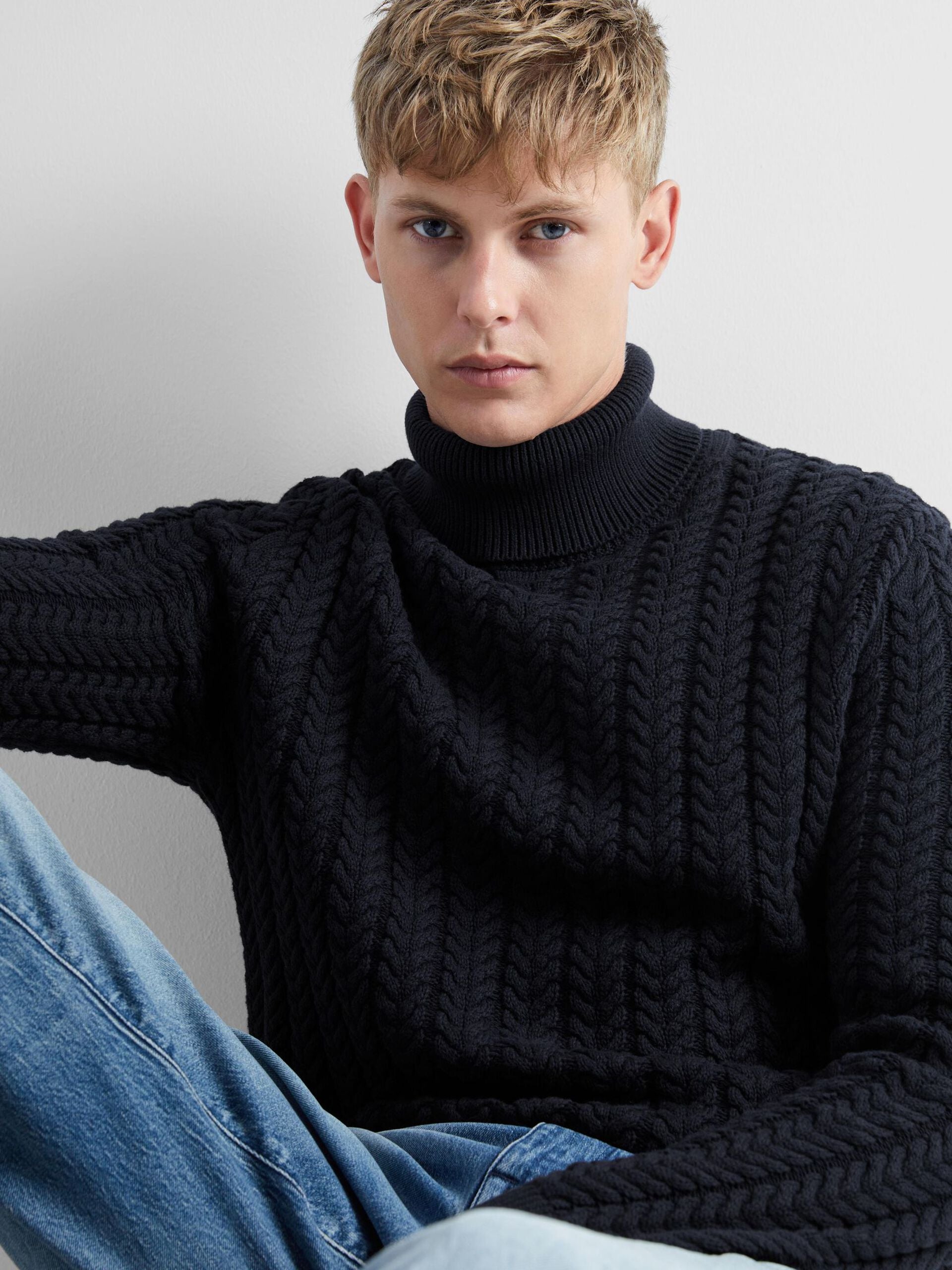 Ce col roulé en maille torsadée vous accompagnera à coup sûr tout au long de l'automne. Il présente un tissage torsadé classique inspiré du riche héritage des pêcheurs et est fabriqué à partir de coton biologique doux et respirant. Portez-le avec un jean foncé et des bottes en cuir. - Col roulé - Manches longues - Bordures côtelées - Modèle en maille torsadée - Coupe droite CONÇU