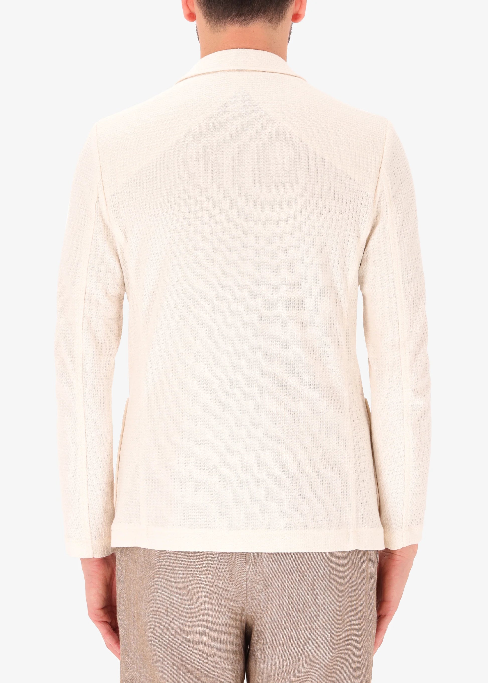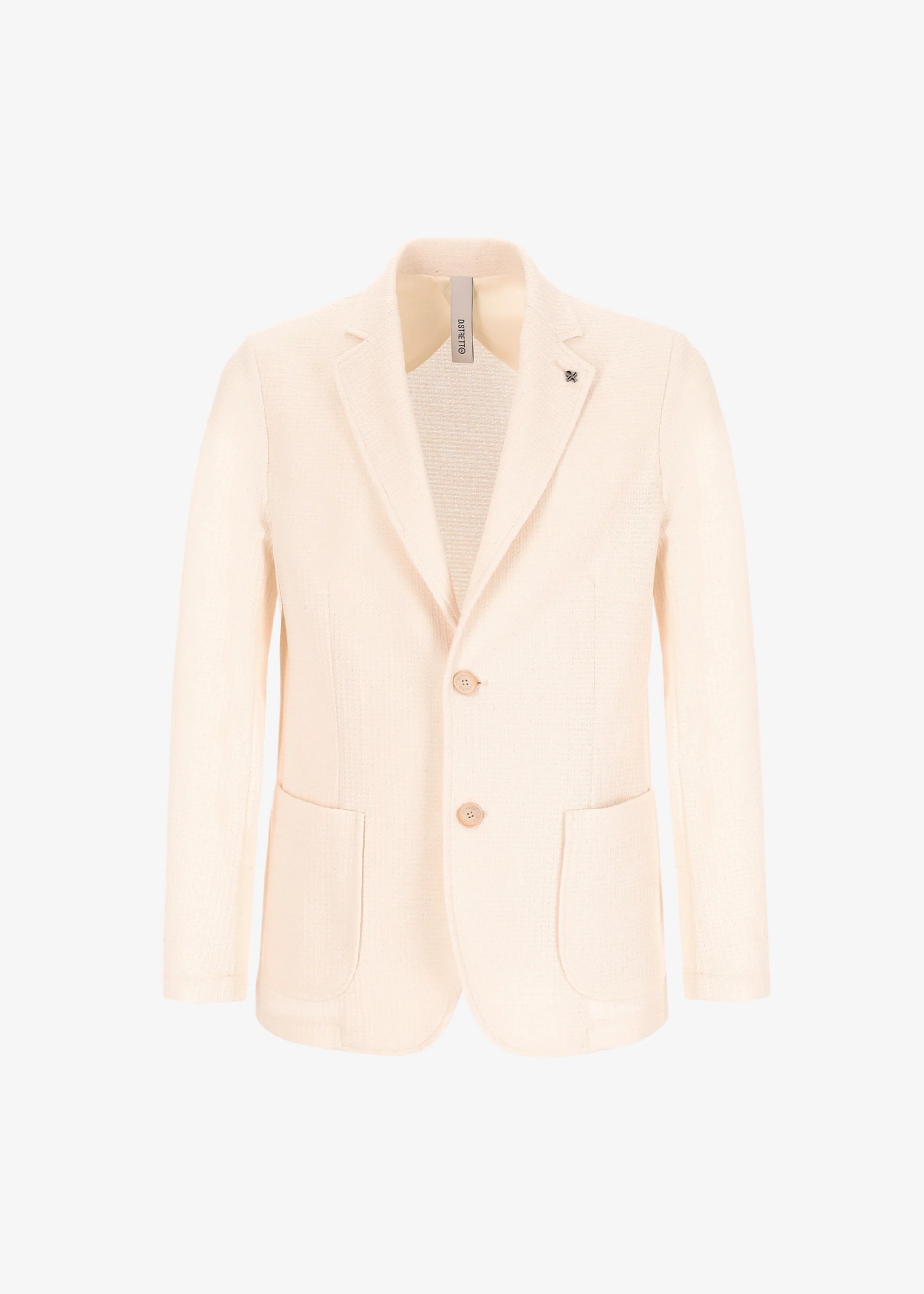Single-breasted jacket in solid super-stretch jersey knit fabric. The garment features a two-button front closure and patch pockets. The interior is unlined, with bias-cut cotton edges and a contrasting fabric pocket.