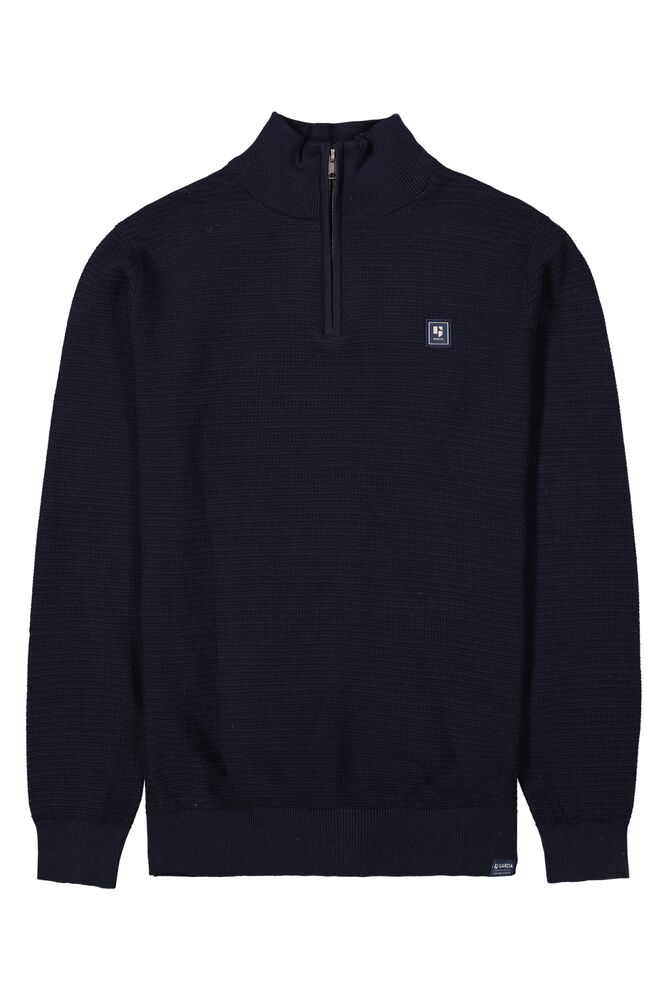 Sweater with Ottoman structure. With this item, you can mix and match endlessly. This sweater features long sleeves, a stand-up collar with a zipper closure, and a regular fit. It is made from 70% cotton and 30% recycled cotton.