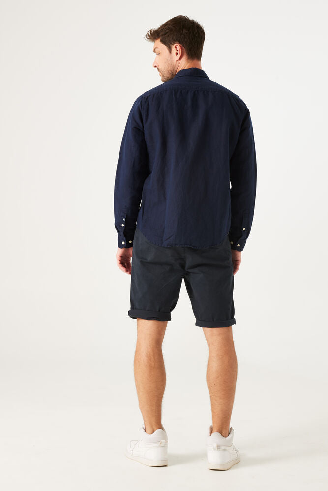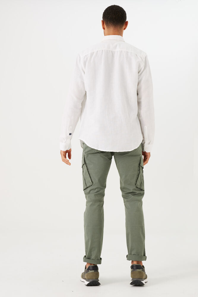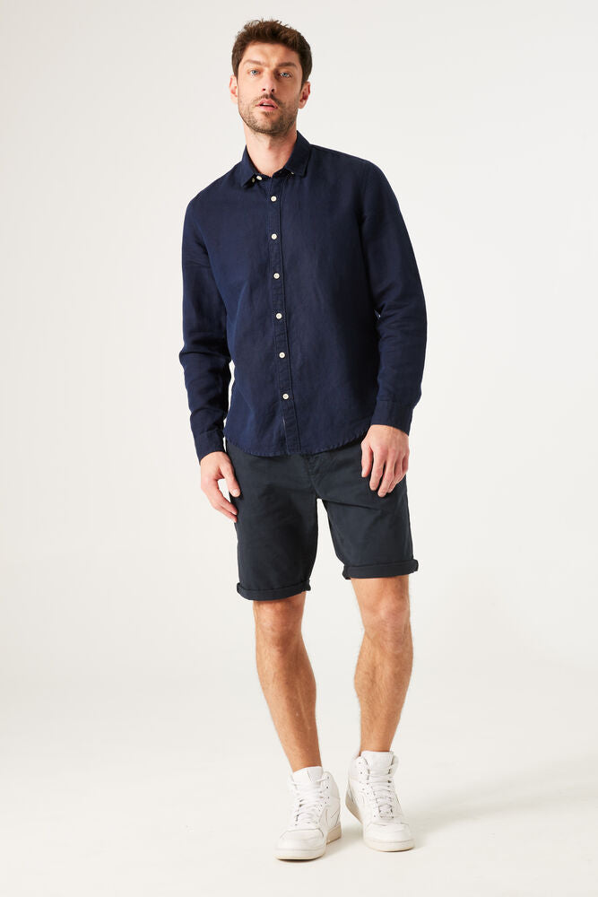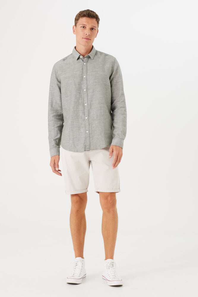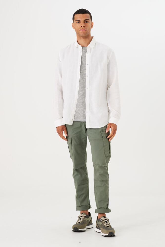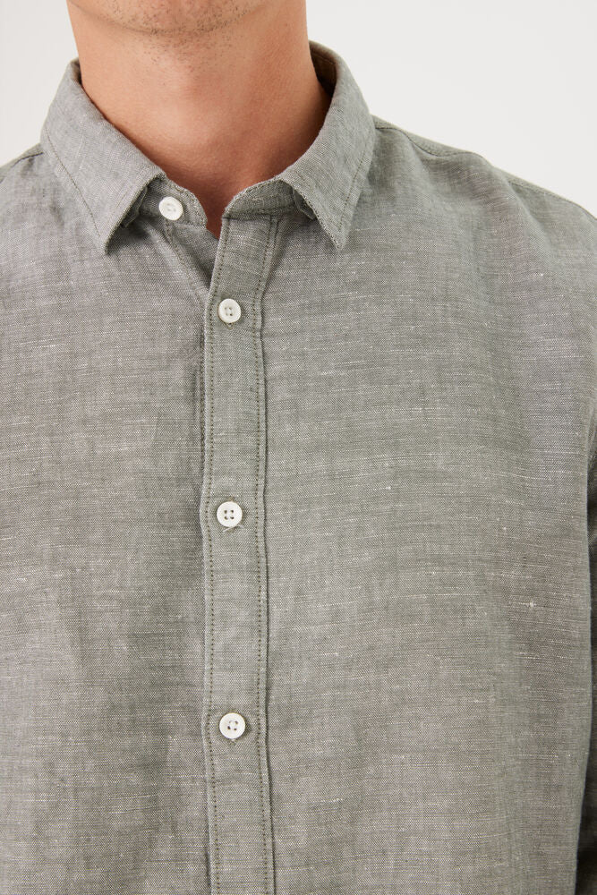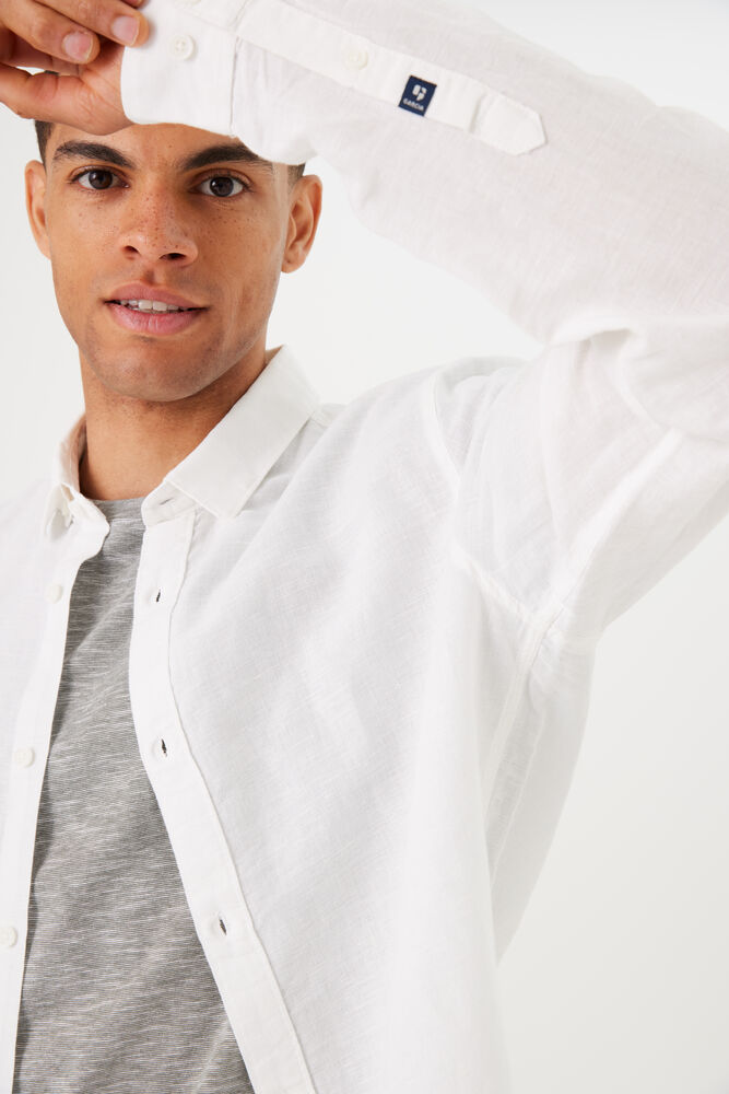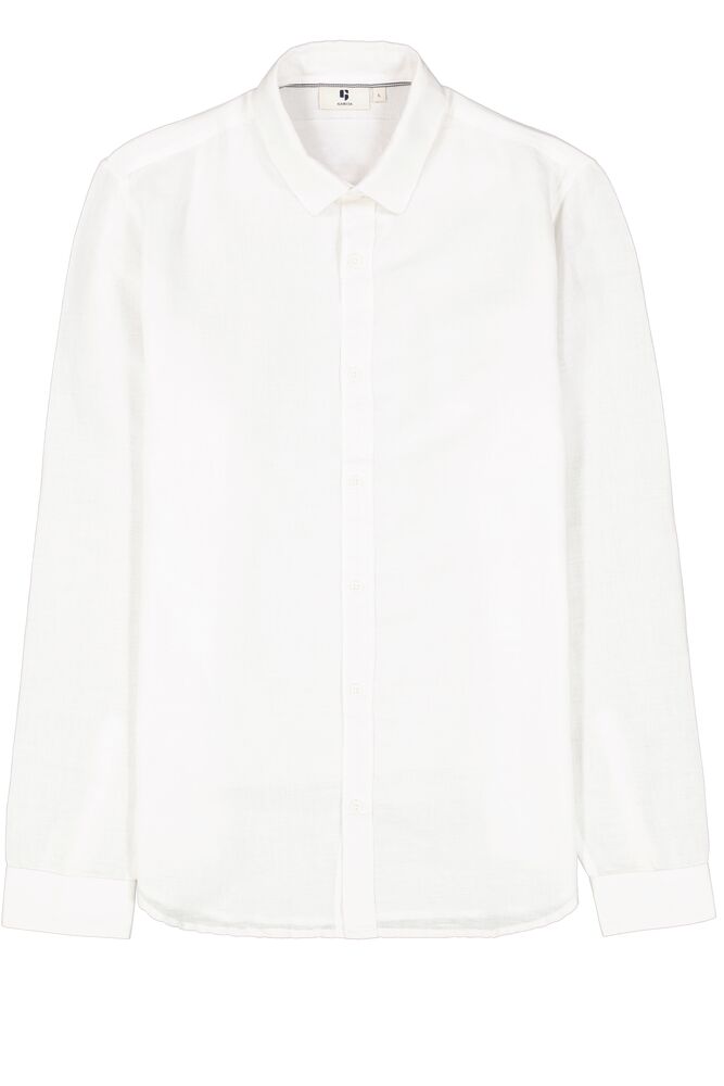 Basic linen shirt. A good basic like this should not be missing in your wardrobe! This shirt has long sleeves, a button closure and a regular fit. This item is made of 55% linen and 45% cotton.