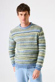 Size The model is 189 cm and is wearing size Large Article numberL51842-8244ColorYellowMaterial36% Polyester, 30% Recycled Polyester, 26% Acryl, 8% Wool Fit Relaxed fit Fabric Space dye Sweater with a trendy space dye pattern. This sweater features a round neck, long sleeves, and a relaxed fit. This item is made of 36% polyester, 30% recycled polyester, 26% acrylic, and 8% wool.