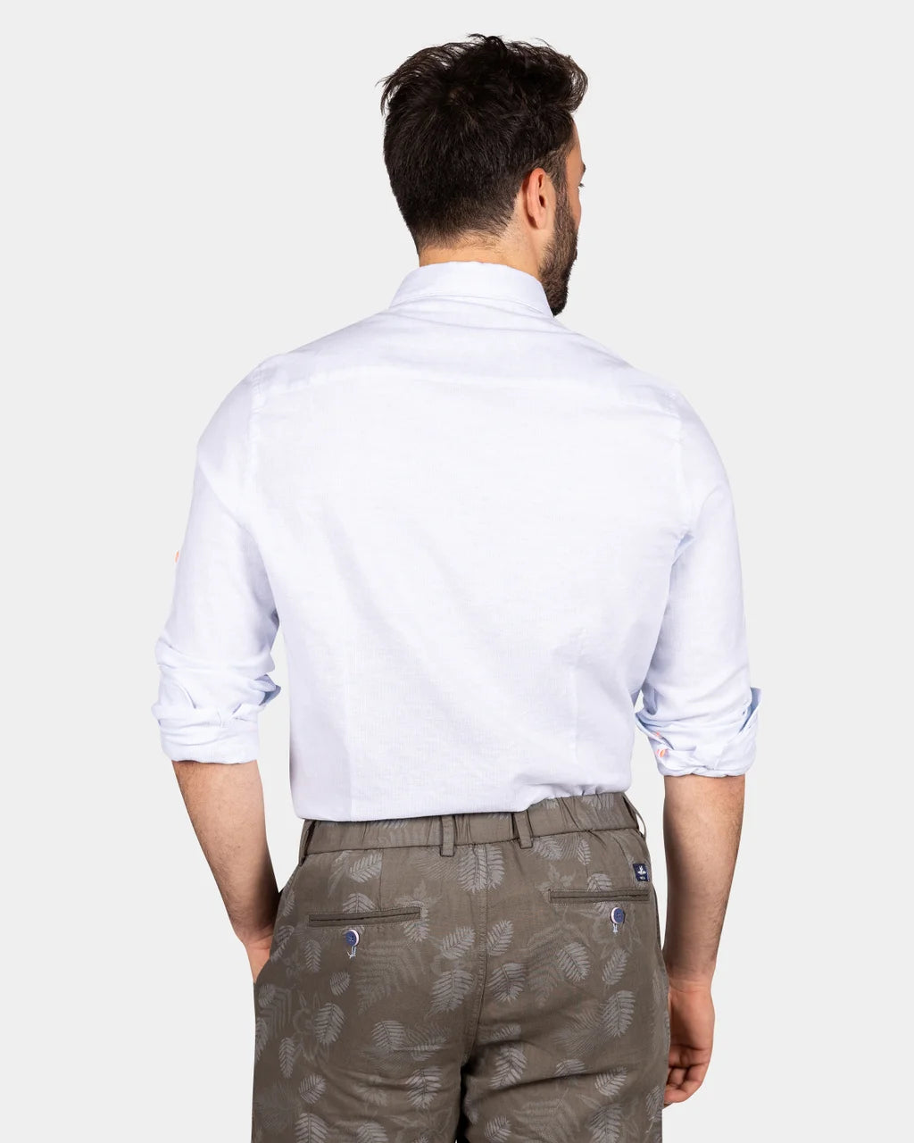 You probably already have a light blue men's shirt. Maybe even a NZA New Zealand Auckland light blue men's shirt. Maybe even a long sleeved linen-cotton-stretch version. But do you have a NZA New Zealand Auckland all over printed linen cotton light blue men's shirt wメth a soft wash finish yet? No? Then go get the Zane! Go go go! Available in Light Sky