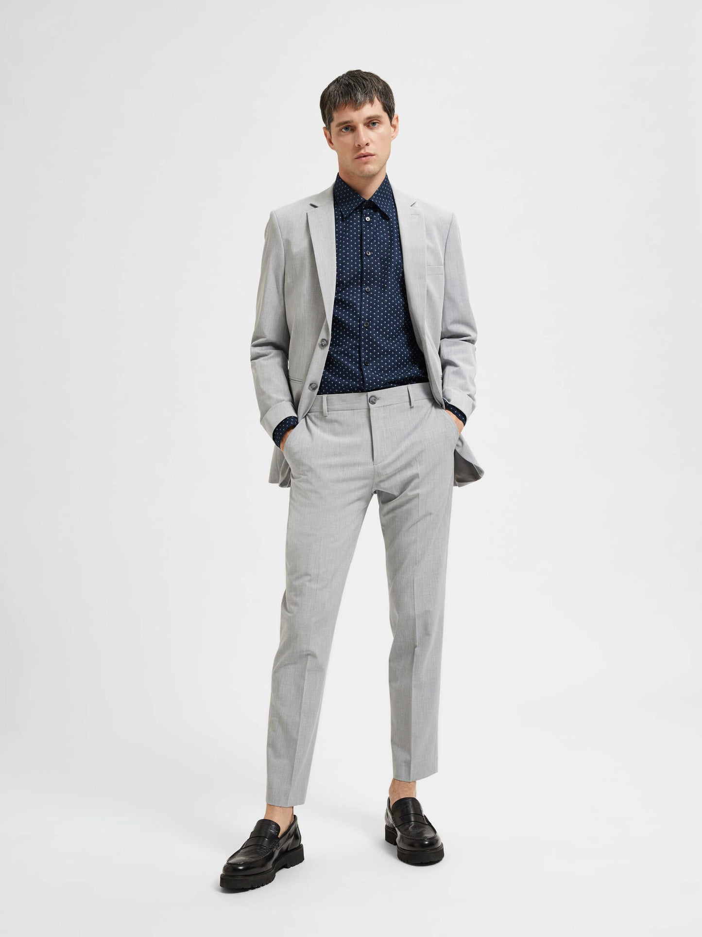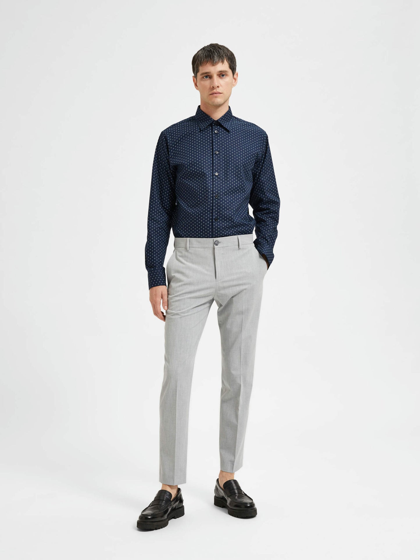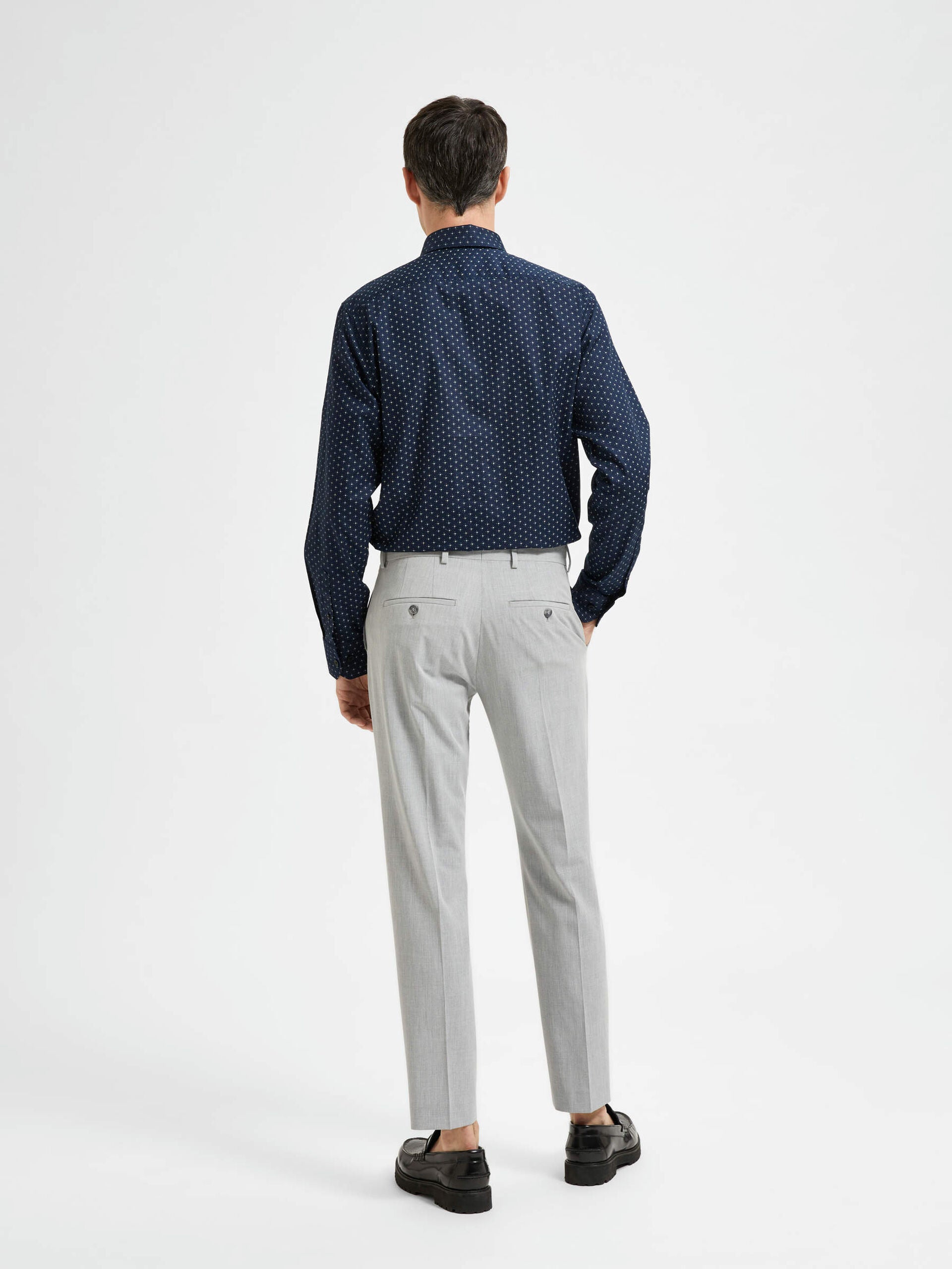 Si vous voulez faire bonne impression, un pantalon bien coupé est la solution. Ce modèle présente une coupe ajustée qui s'affine au niveau de la jambe et se termine juste au-dessus de la cheville. Il présente des détails sophistiqués comme des plis pressés au centre et des poches arrière à boutons. Parfait pour le bureau, il sera superbe avec une chemise boutonnée et des mocassins en cuir. Enfilez un pull en laine mérinos lorsque le temps se rafraîchit.