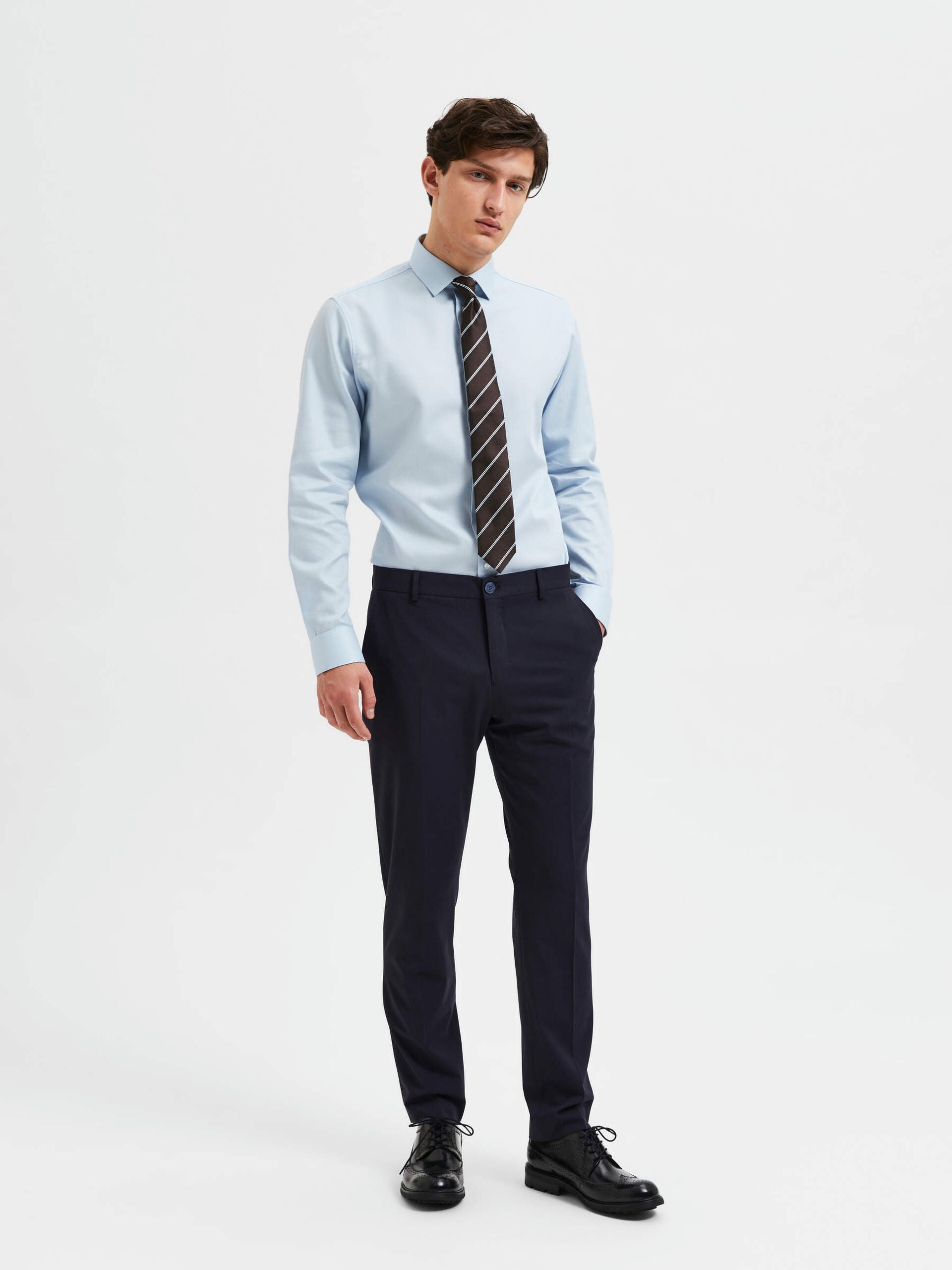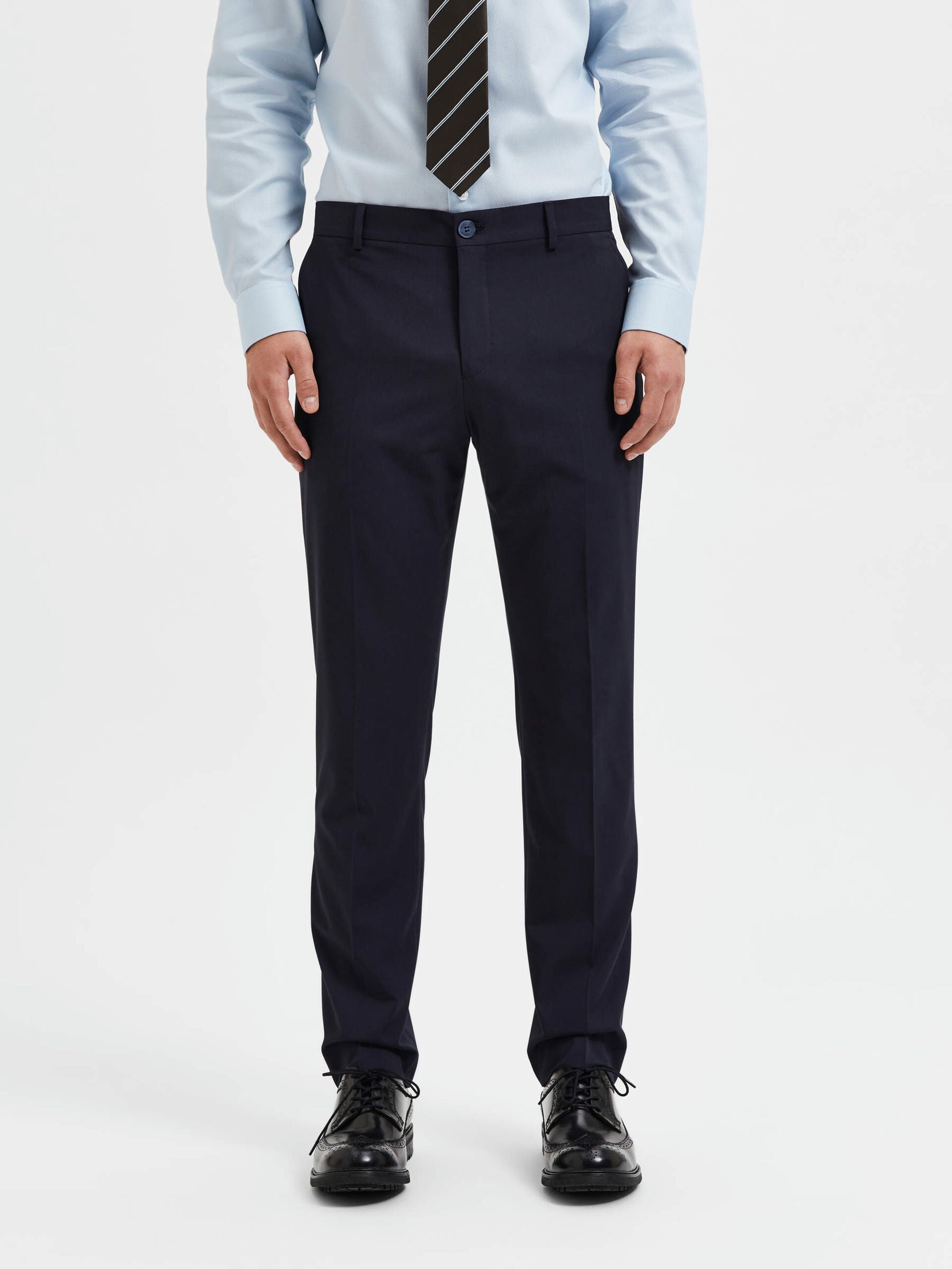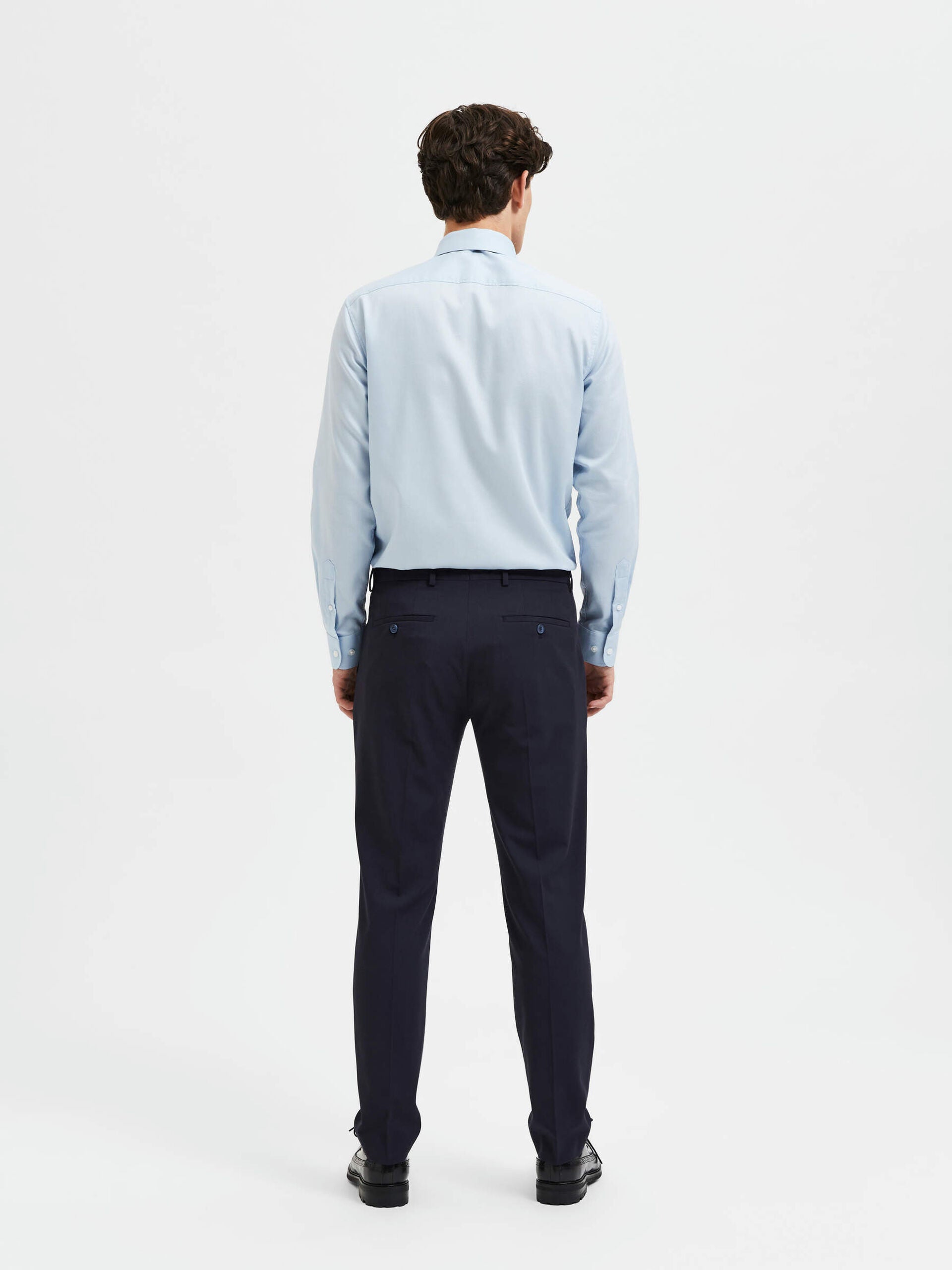 Si vous voulez faire bonne impression, un pantalon bien coupé est la solution. Ce modèle présente une coupe ajustée qui s'affine au niveau de la jambe et se termine juste au-dessus de la cheville. Il présente des détails sophistiqués comme des plis pressés au centre et des poches arrière à boutons. Parfait pour le bureau, il sera superbe avec une chemise boutonnée et des mocassins en cuir. Enfilez un pull en laine mérinos lorsque le temps se rafraîchit.