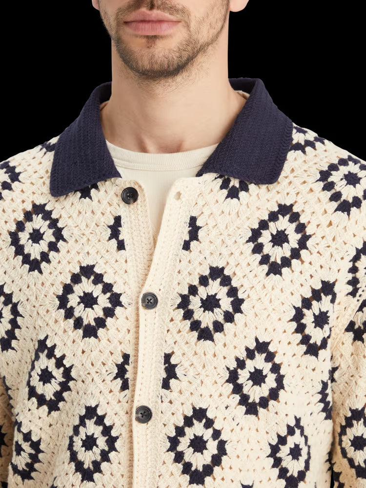 Combining cotton and acrylic, this Crochet Knit Long Sleeve Polo brings a cozy yet edgy twist to your wardrobe. Ideal for cooler evenings or chic casual events, its crochet detail adds a bespoke touch to relaxed attire.This polo is perfect for those who redefine everyday dressing.