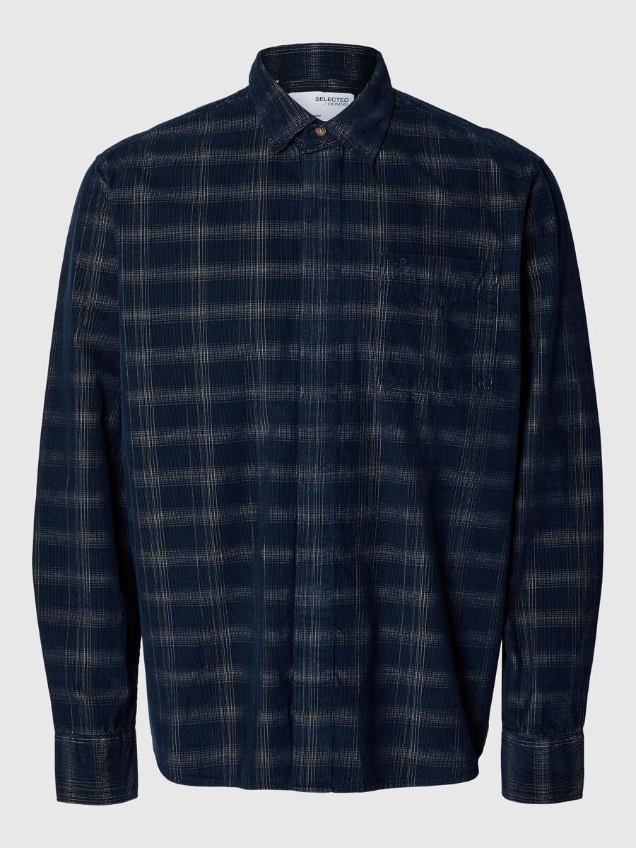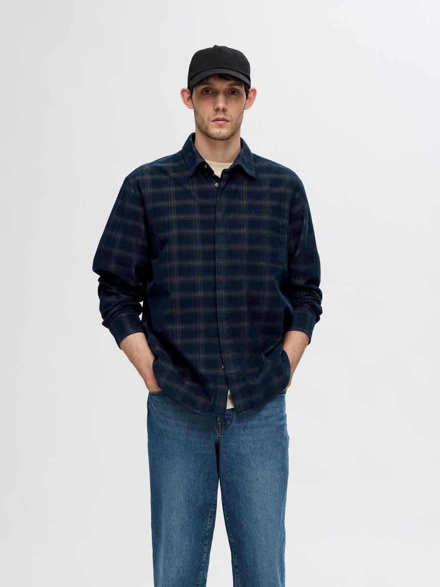 Corduroy and checks are a match made in heaven. This checked corduroy shirt has a classic tailored look to it and is made from recycled cotton, making it lightweight, breathable, and extra soft. Wear it with dark-wash denim and leather boots. - Regular collar - Button-up front - Long sleeves with buttoned cuffs - Patch pocket at chest - Made from 100% cotton - Relaxed fit
